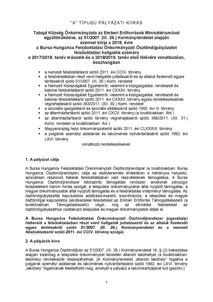 Hirdetmény Hírek Közérdekű közlemények 2018. évre Bursa Hungarica „A” TÍPUSÚ PÁLYÁZATI KIÍRÁS 2017. október 10. kedd siteadmin