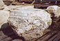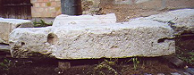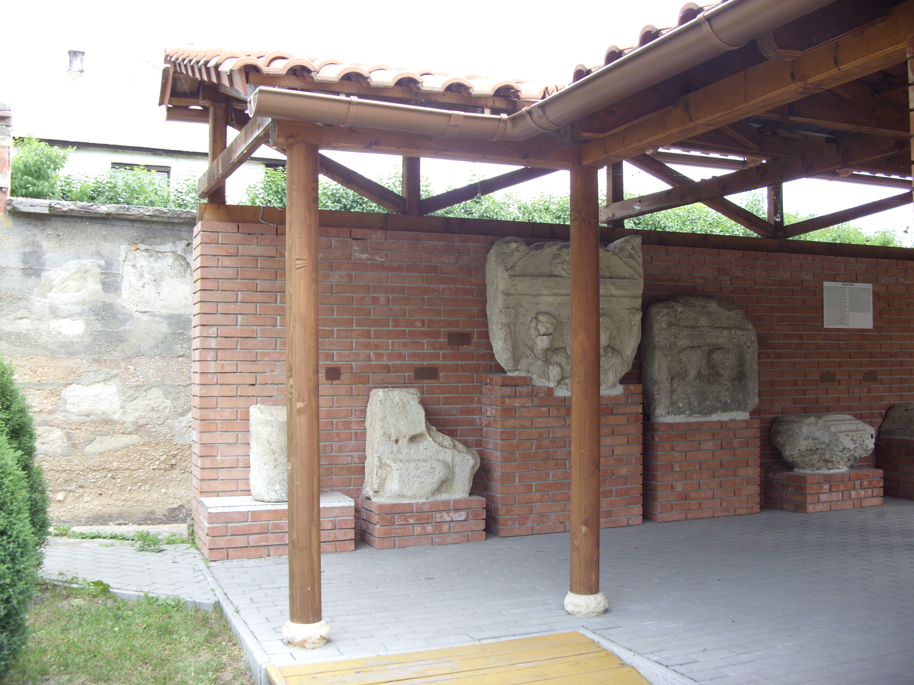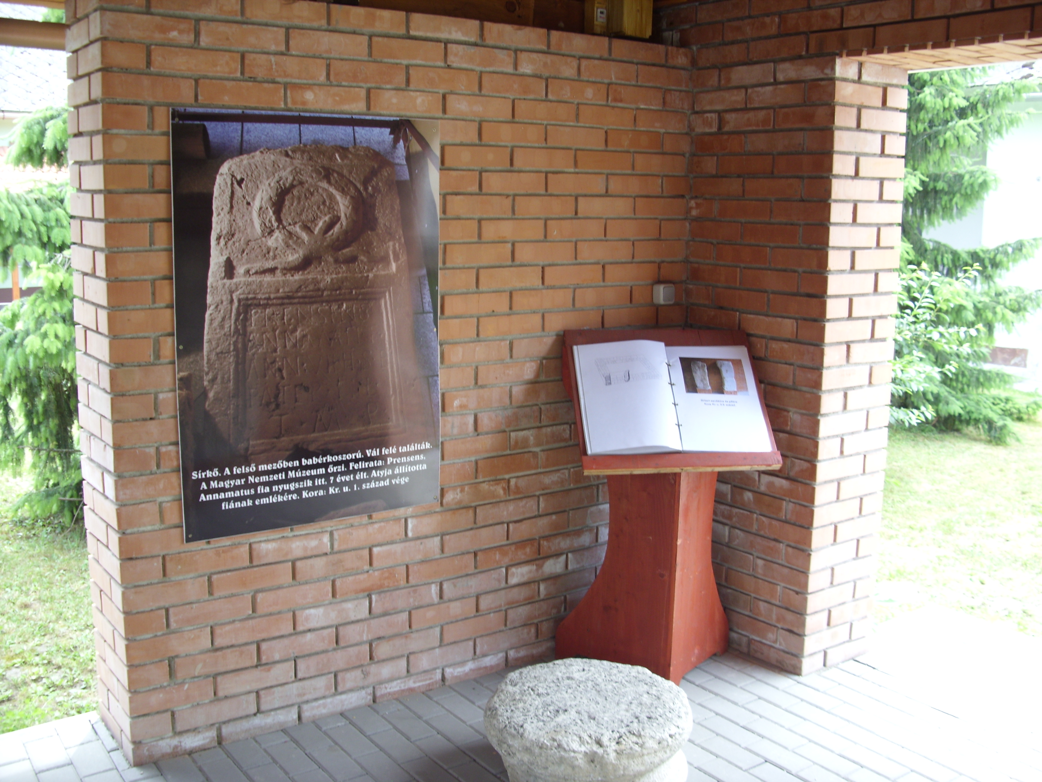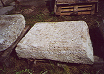 1. Négyszögű sírkert sarokkövének darabja. Levágott homlokoldalát lépcső vagy küszöbkő gyanánt simára koptatták. Felül plasztikai díszítés maradványa látszik. A baloldali profilálás a hornyolat helyét mutatja, ahová a sírkert oldalfala illeszkedett.