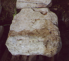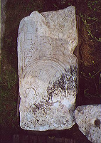 3. Síraedicula oldalfala. Félkör alakban kivágott oldal fallap, amely prostylos oszlopokkal díszített síraediculához tartozott. Méretét a felsõ szegélyén lévõ két csaplyuk (5×5 cm) mutatja. A baloldali csaplyuk mellett a kapocs helye, amellyel a homlokzati fallaphoz csatolták. A homlokzat lehetett hasonló ívben kivágott vagy egyenes áthidalású is. Az ívtõl jobbra a falsíkot pillér díszíthette. Sátortetős lehetett. A homlokzati levélfejezetes tartó oszlop magassága min. 1,60 m, az alapzatot és a talapzatot is figyelembe véve, valamint, hogy egyszintes (nem kétszintes) volt a felállítás magassága: 2 m Sz: 190 cm M: 110 (50) cm V: 36 cm
