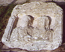 8. Házaspár mellképes sírköve. Bennszülött kelta viseletben, pillérek keretelik. A tympanonban rosetta. A mellképes mezõ alatt a feliratos rész hiányzik. Sz: 98 cm M: 100 cm V: 30 cm Felállítás magassága: 120 cm