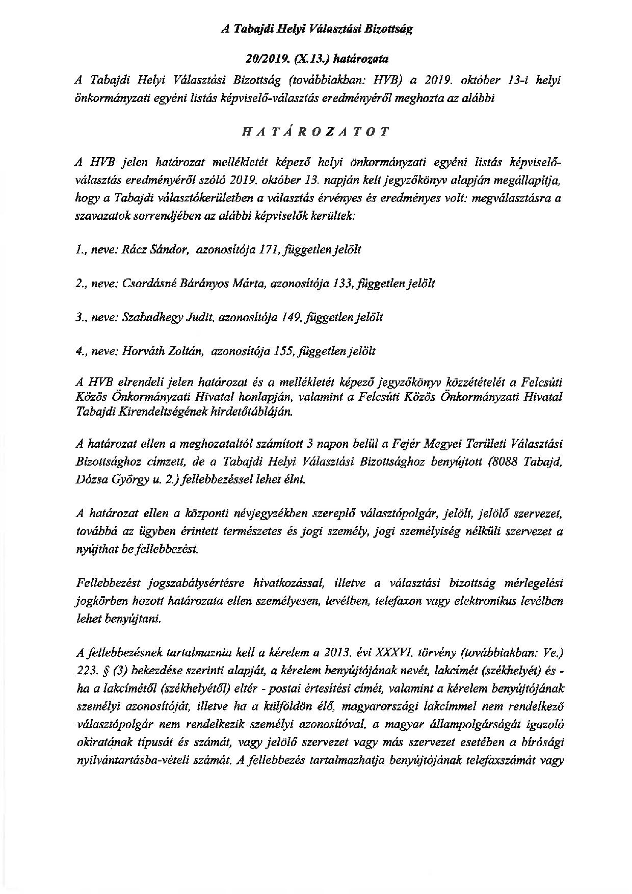 ÖNKORMÁNYZATI VÁLASZTÁS 2019 A Tabajdi Helyi Választási Bizottság 20/2019. (X.13.) határozata 2019. október 14. hétfő2019. október 15. kedd siteadmin