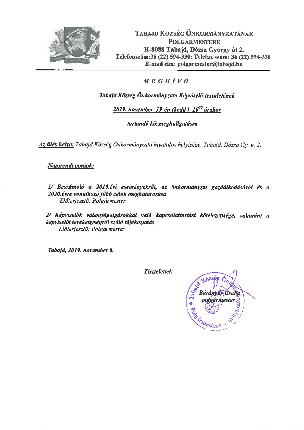 Nincs kategorizálva Meghívó Tabajd Község Önkormányzata Képviselő-testületének 2019. november 19-én (kedd) 16:00 órakor tartandó közmeghallgatásra 2019. november 11. hétfő siteadmin