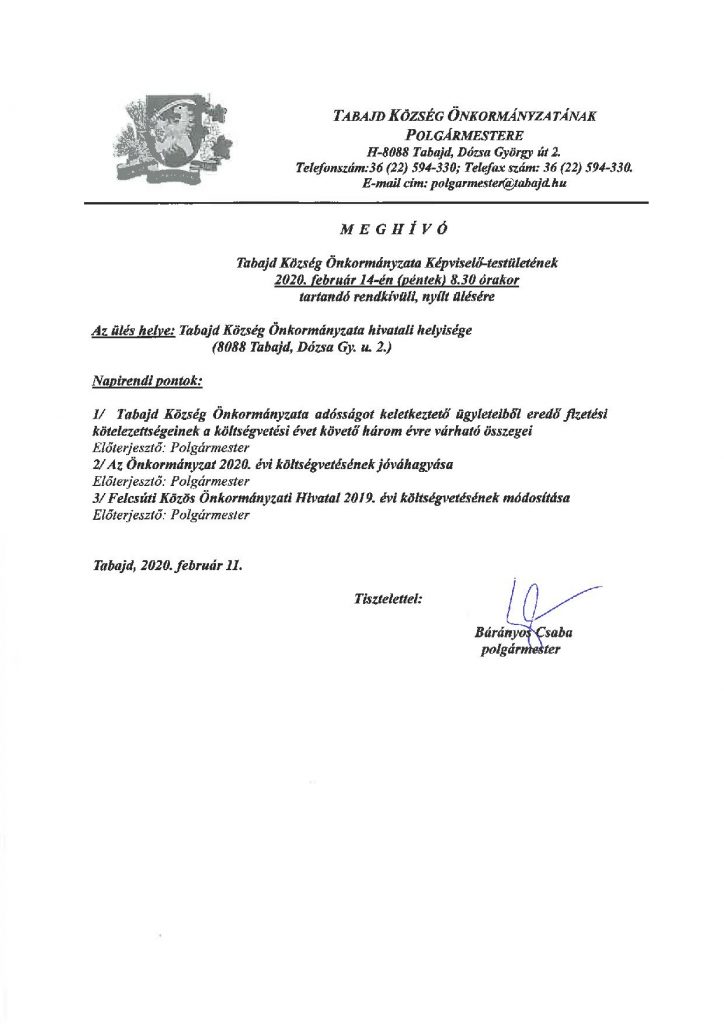 Hírek Meghívó Tabajd Község Önkormányzata Képviselő-testületének 2020. február 14. (péntek) 8:30 órakor tartandó rendkívüli, nyílt ülésére 2020. február 13. csütörtök2020. február 13. csütörtök siteadmin